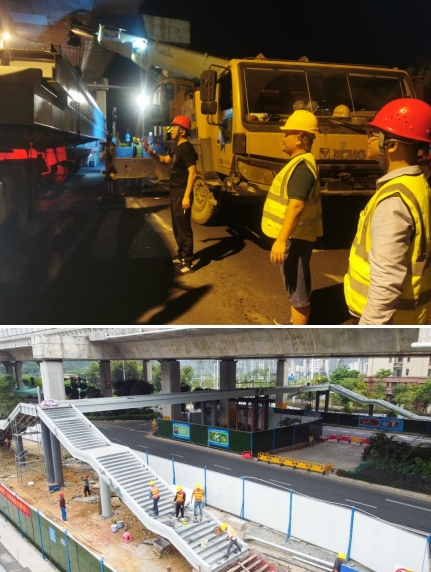 由于人行天橋項(xiàng)目建設(shè)所處的位置地下含高壓線等管線,施工環(huán)境較為復(fù)雜,且又處在交通通行量大的東環(huán)高速高架橋下,由于空間受限,鋼箱梁吊裝與高架橋最近的距離僅有5公分,吊裝難度極大。為此,我們采取雙吊車協(xié)同施工、錯峰施工和夜間施工的辦法。為確保施工安全,市政集團(tuán)從上至下高度重視,由集團(tuán)領(lǐng)導(dǎo)帶隊(duì),項(xiàng)目總工及各職能部門主要人員齊上陣,從交通協(xié)調(diào),運(yùn)梁車跟隨指導(dǎo),安全措施落實(shí)及現(xiàn)場架梁的線位等多方面進(jìn)行把控,主要負(fù)責(zé)人靠前指揮,帶領(lǐng)黨員干部及時(shí)協(xié)調(diào)解決吊裝過程中遇到的問題,充分發(fā)揮出黨支部戰(zhàn)斗堡壘和黨員的模范帶頭作用。