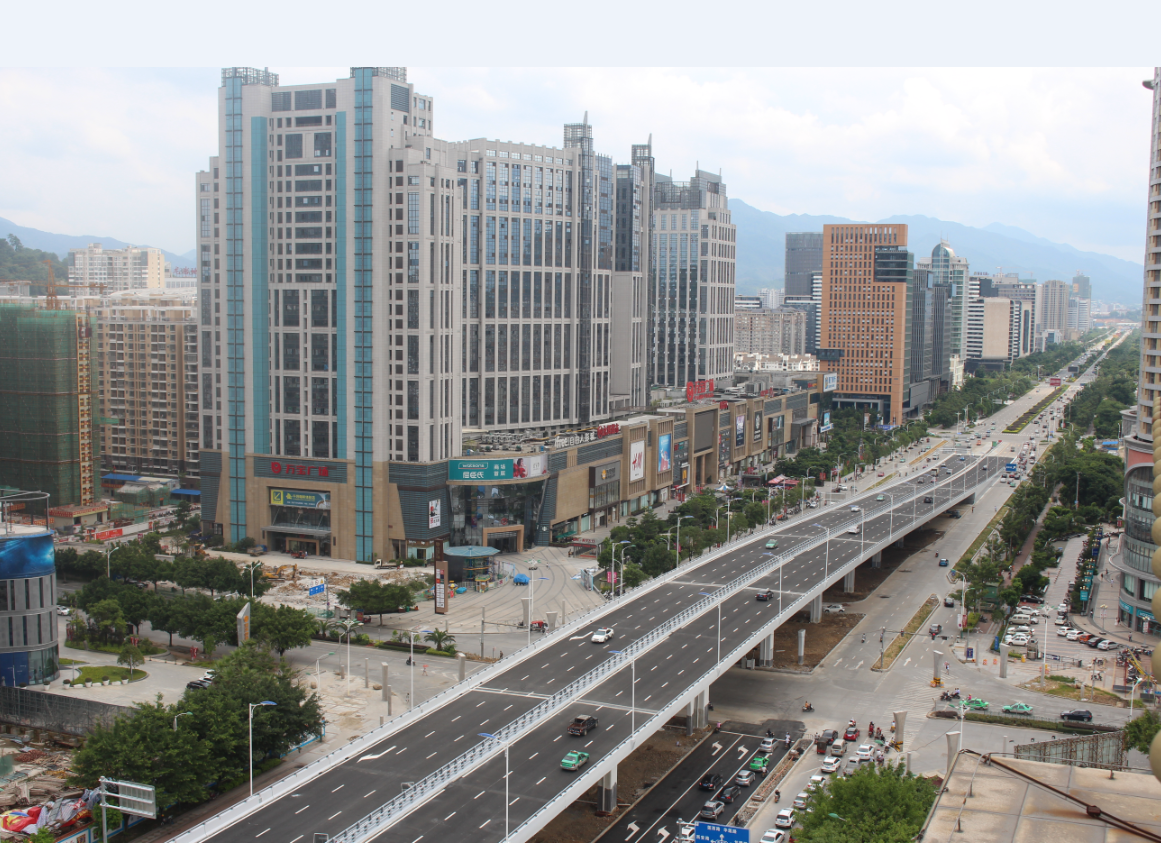 龍巖大道高架橋項(xiàng)目為省、市重點(diǎn)建設(shè)項(xiàng)目,是龍巖中心城市連接南北、溝通新老城區(qū)的重要樞紐,項(xiàng)目位于龍巖市南北交通中心軸和景觀軸線龍巖大道上,全長(zhǎng)3395m,包含橋梁和地面道路兩大部分,其中橋梁工程總長(zhǎng)2329m,橋?qū)?6m,包含一座190+150m獨(dú)塔斜拉索鋼箱梁主橋(主橋?qū)?6.3m),全線設(shè)計(jì)為雙向六車道,設(shè)計(jì)車速60km/h,在西陂路及人民路處各設(shè)置上下匝道,跨越雙洋路、羅龍東路、人民路、登高西路、西陂路城市主干道,項(xiàng)目總投資約24億元。