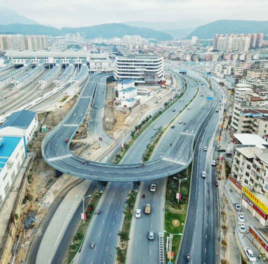 該項目屬于火車站北片區(qū)“一橫一縱一環(huán)”路網中的一環(huán),是火車站北站房片區(qū)的重點工程,也是連接羅龍路與火車站北站房旅客出發(fā)平臺的唯一通道,項目建成對完善片區(qū)功能開發(fā)需要具有重要意義。1月1日起,站前高架橋已順利通車,前往出發(fā)層的市民可從高架橋進入北站房,而到站旅客將從廣場出站,進出分流,交通疏導更加順暢。