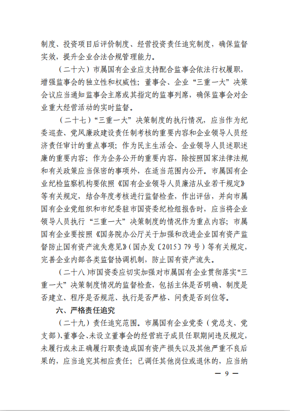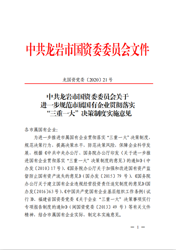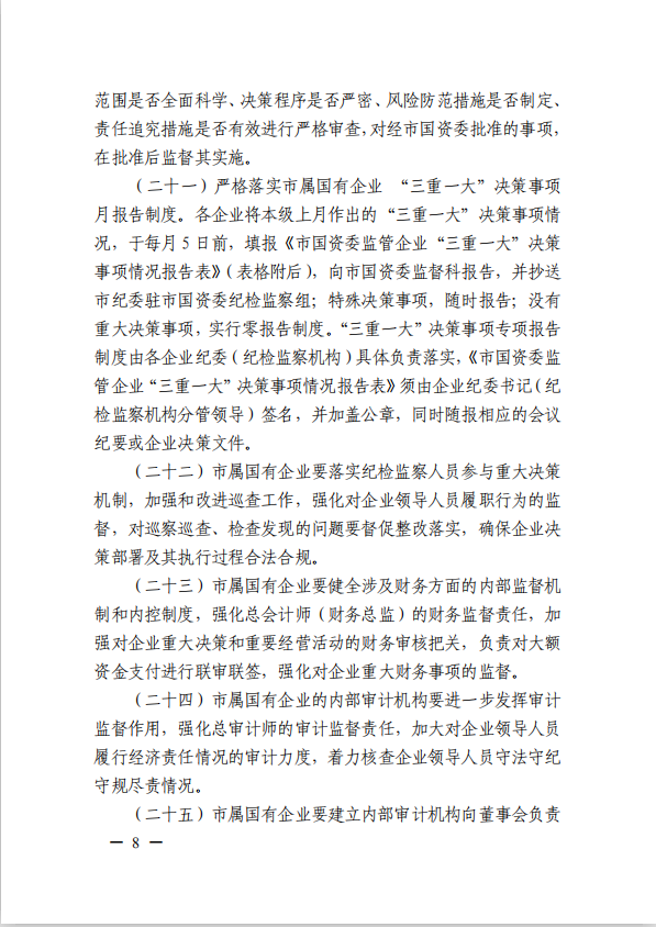關(guān)于進(jìn)一步規(guī)范市屬國有企業(yè)貫徹落實(shí)“三重一大”決策制度實(shí)施意見(國資黨委[2020]21號)