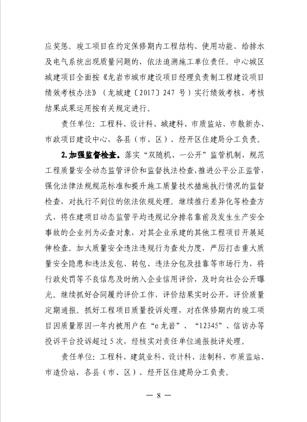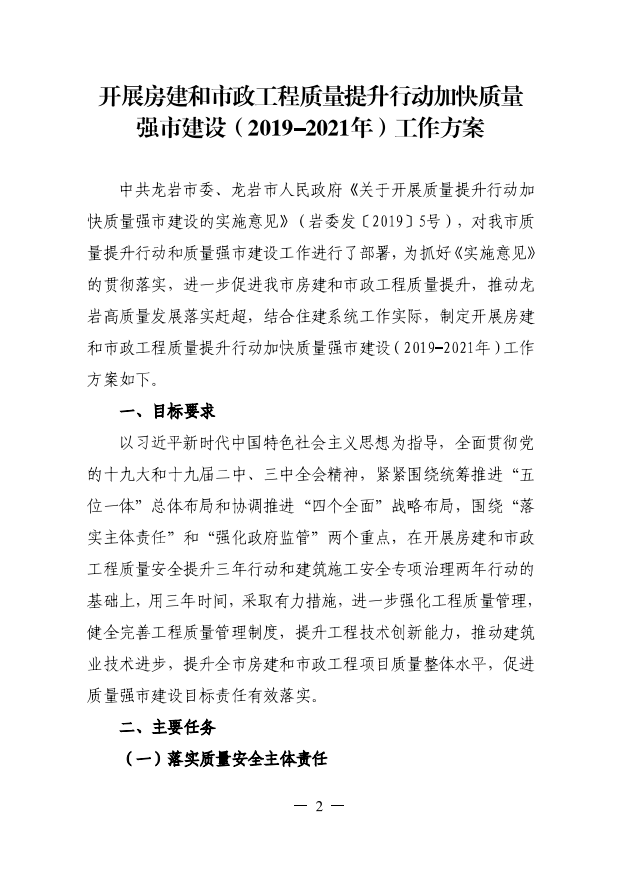 龍巖市住房和城鄉(xiāng)建設(shè)局關(guān)于印發(fā)開展房建和市政工程質(zhì)量提升行動加快質(zhì)量強(qiáng)市建設(shè)(2019-2021年)工作方案的通知