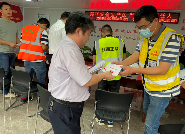 現(xiàn)場徐旺興董事長、修海金副總經(jīng)理分別向項(xiàng)目部人員及工人現(xiàn)場分發(fā)《安全生產(chǎn)法》及“五進(jìn)”等宣傳資料。